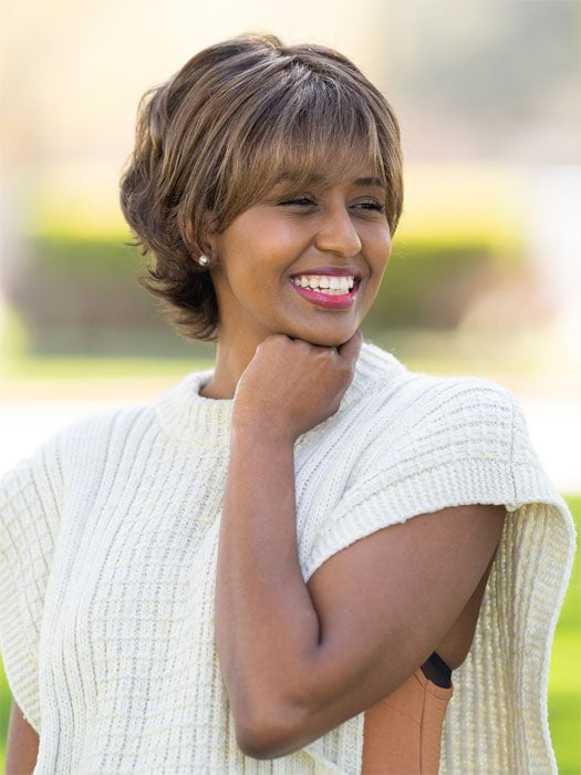 Carte Blanche by is a fresh take on the classic fluff-back silhouette, this short, barely waved cut includes a hand-knotted top and for natural looking, off-the-face styling. Also available in , beautiful shades of grey.