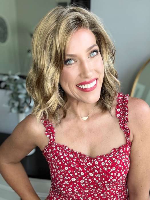 Charlotte by showcases a wavy, layered bob that extends past the chin for a mid-length hairdo. The has a part that creates the look of hair growth. The gives the illusion of natural hairline.