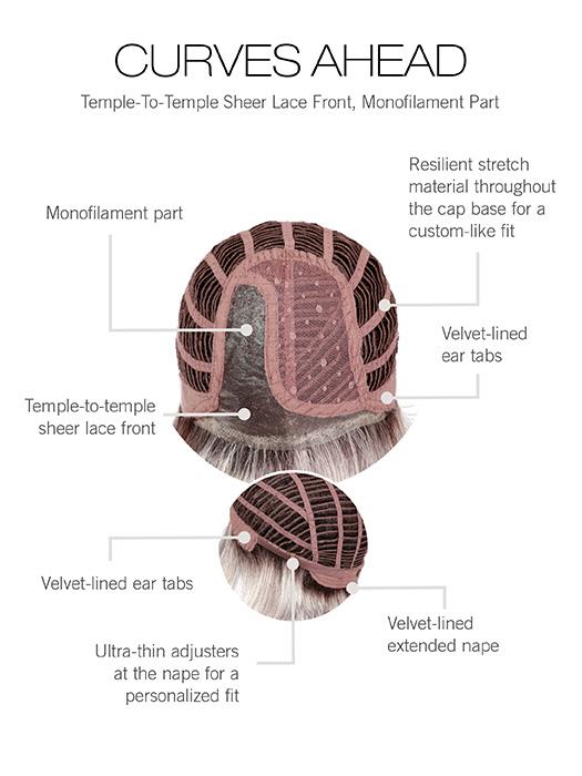 Curves Ahead by is a sophisticated bob cut with a side-swept bang. The extended lace front hairline and monofilament part make this synthetic style effortlessly natural. If you're looking for layers and bouncy body, Curves Ahead is the short style for you!