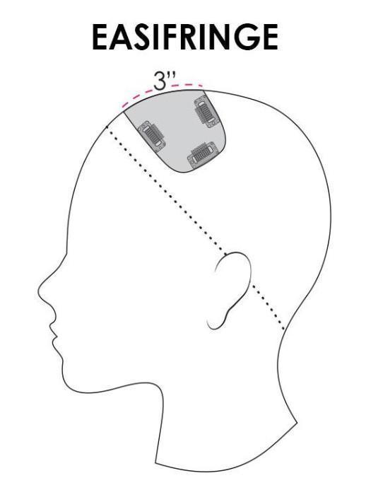 easiFringe Human Hair Exclusive Colors by easihair is a face-framing fringe that can be custom cut to achieve any bang look. Because of the unique base size which measures 6 ½" x 3 ¼", easiFringe not only gives you face framing layers but added volume as well. Made with 100% Remy human hair you can style it just like your own hair and it looks incredibly natural. The hair measures 8" at the front and 14" at the sides and back. A monofilament section at the front gives you the appearance of your own natural scalp. easiFringe applies easily with 6 pressure sensitive clips and is available in a variety of colors. Whether you wear easiFringe as it comes or custom cut it, easiFringe is as versatile as you! easiFringe can be trimmed, by a Professional, to achieve the blunt cut look.(The fringe is customized to reflect blunt bangs as an option)