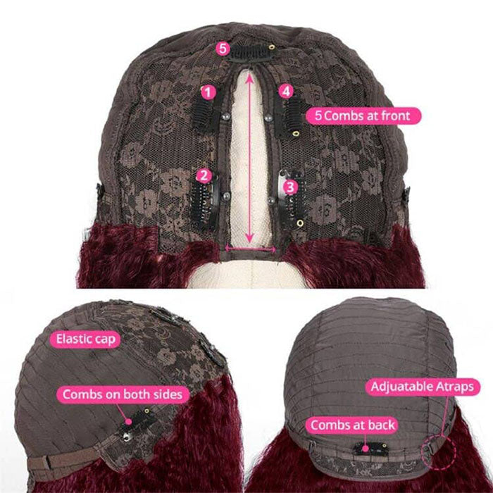 Glueless V/U Part Jerry Curly Wig 99J Burgundy Red Color With Dark Roots Beginner Friendly