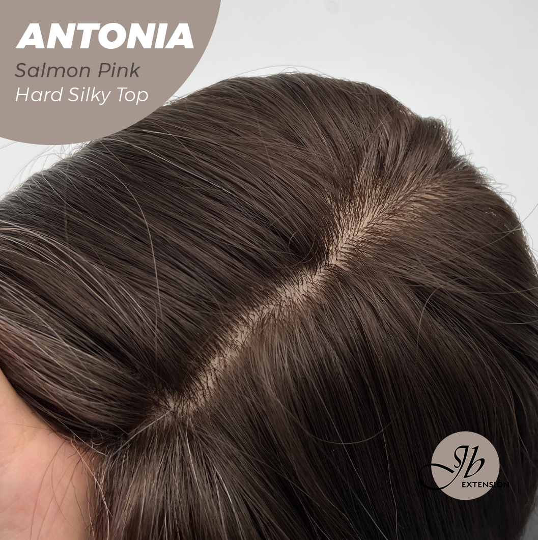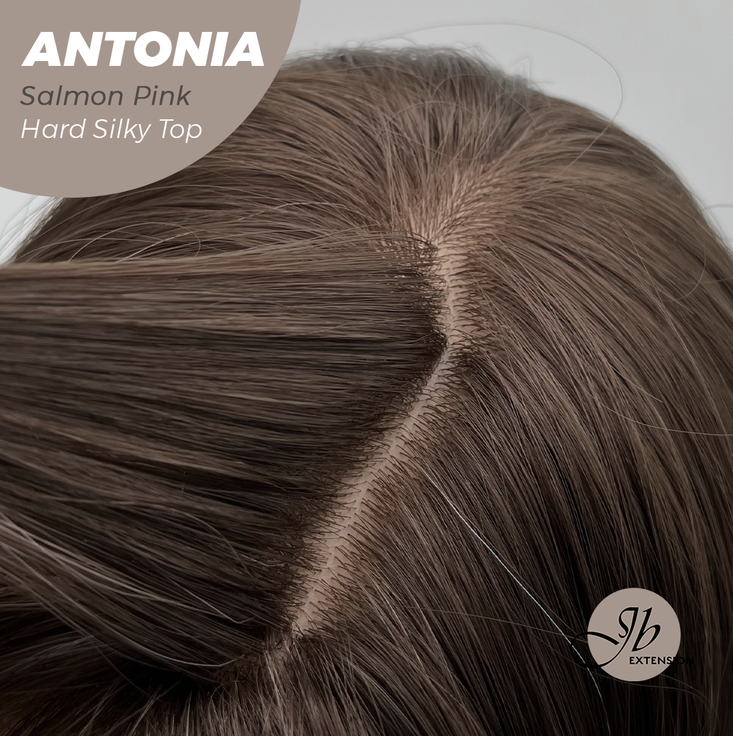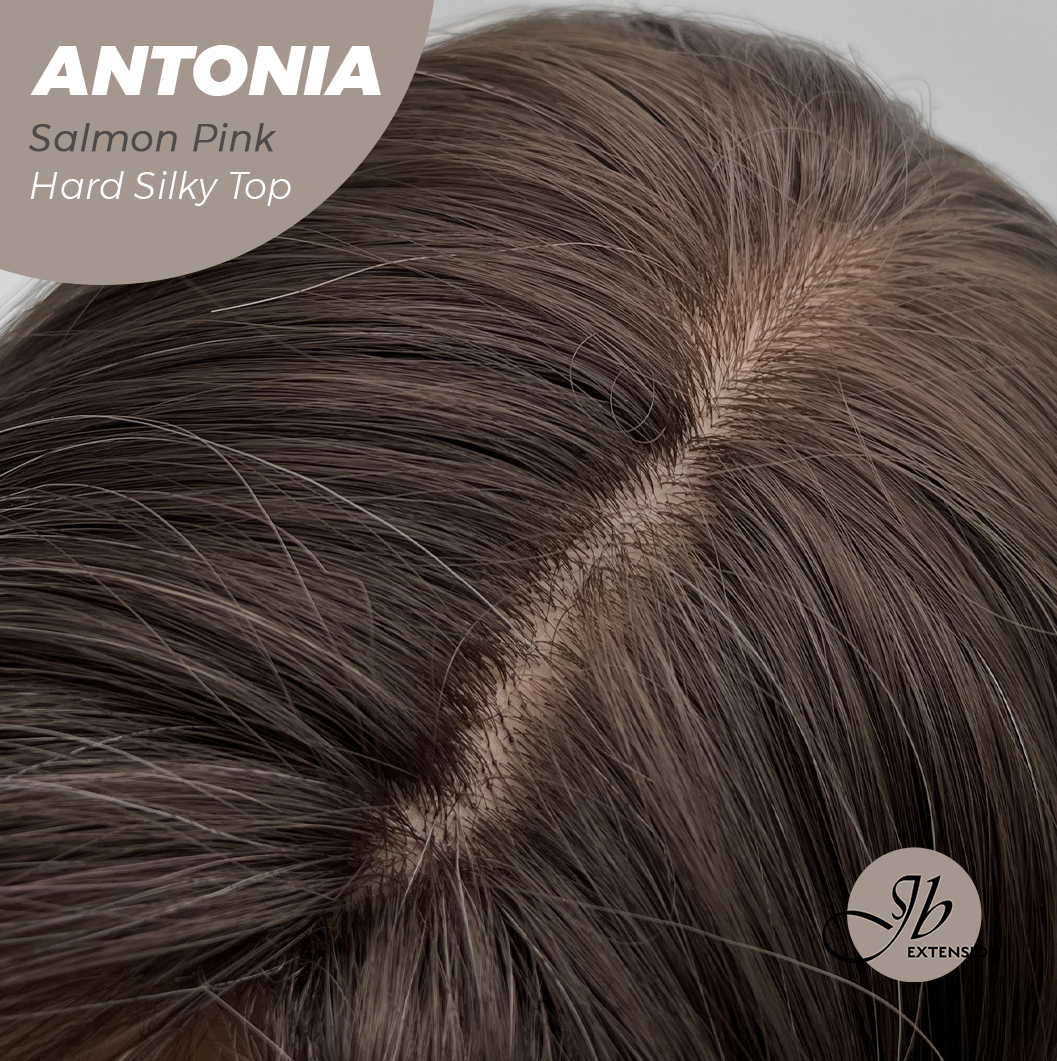 JBEXTENSION 28 Inches Scalpiana Long Curly Salmon Pink 3.5X4 Hard Silky Top Natural Scalp Effect Wig ANTONIA SALMON PINK