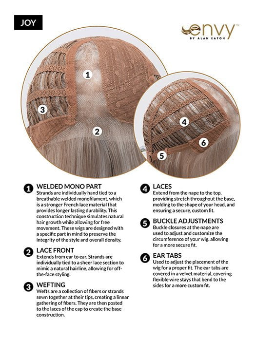 Joy by Envy is a long layered synthetic wig with fringe. Face-framing layers provide movement, and create a light and airy texture that compliment your face and head shape. This style features a lace front and monofilament part creating an extremely natural look that is easy to wear!