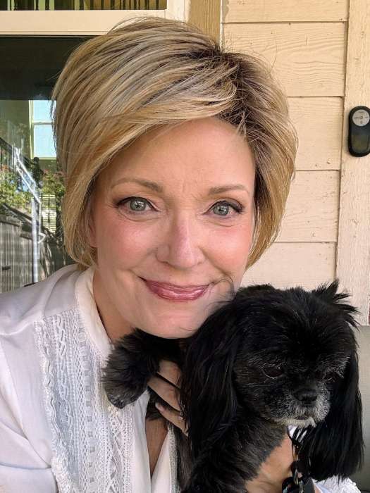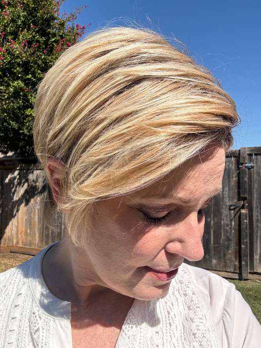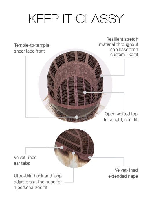 Keep It Classy by Gabor is an adorable short wig with long wispy bangs and stacked back. The choppy layers add a generous amount of volume. The synthetic hair is made with Tru2Life heat friendly fiber, so you can flip up the ends for added texture or smooth down the hair. The cap includes a wefted top for breathability and an extended lace front for a seamless hairline.