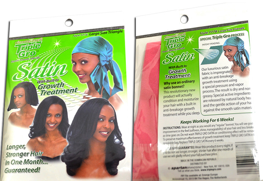 NAME: Triple Gro Satin Large Size Triangle 7778 DESCRIPTION: Satin with built in growth treatment / Why use an ordinary satin bonnet? - This revolutionary new product will actually condition and moisturize your hair with a built in anti-breakage growth treatment while you sleep. / Our luxurious satin fabric is impregnated with an anti-breakage growth treatment using a special pressure and vapor process. / The result is dry and non greasy. Special active ingredients are released by natural body heat and the gentle action of your hair against the smooth satin material.